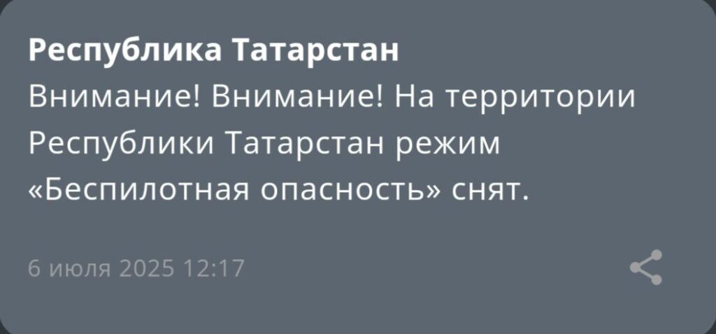 В Татарстане в 12.17 отменено действие режима беспилотной опасности. Соответствующее оповещение направило в своем приложении МЧС России.
