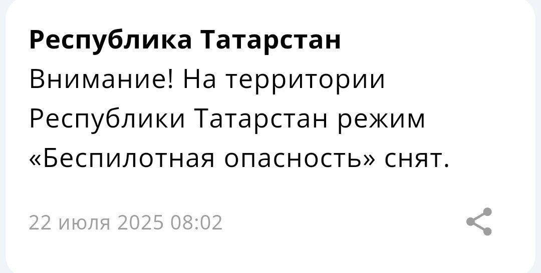 Режим «Беспилотная опасность», введенный в Татарстане около 2 часов ночи, был отменен. МЧС России оповестил жителей и гостей республики об этом через свое приложение.