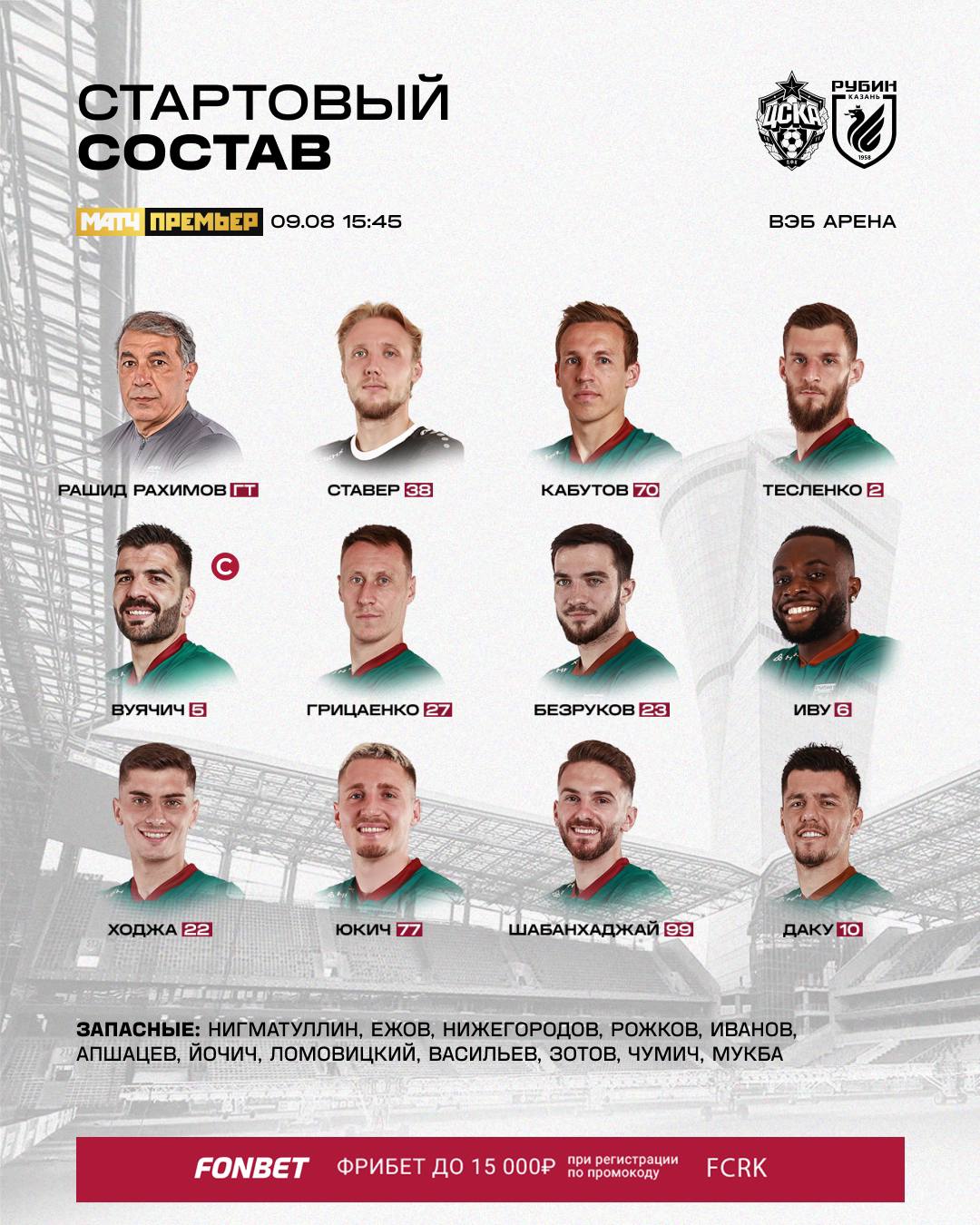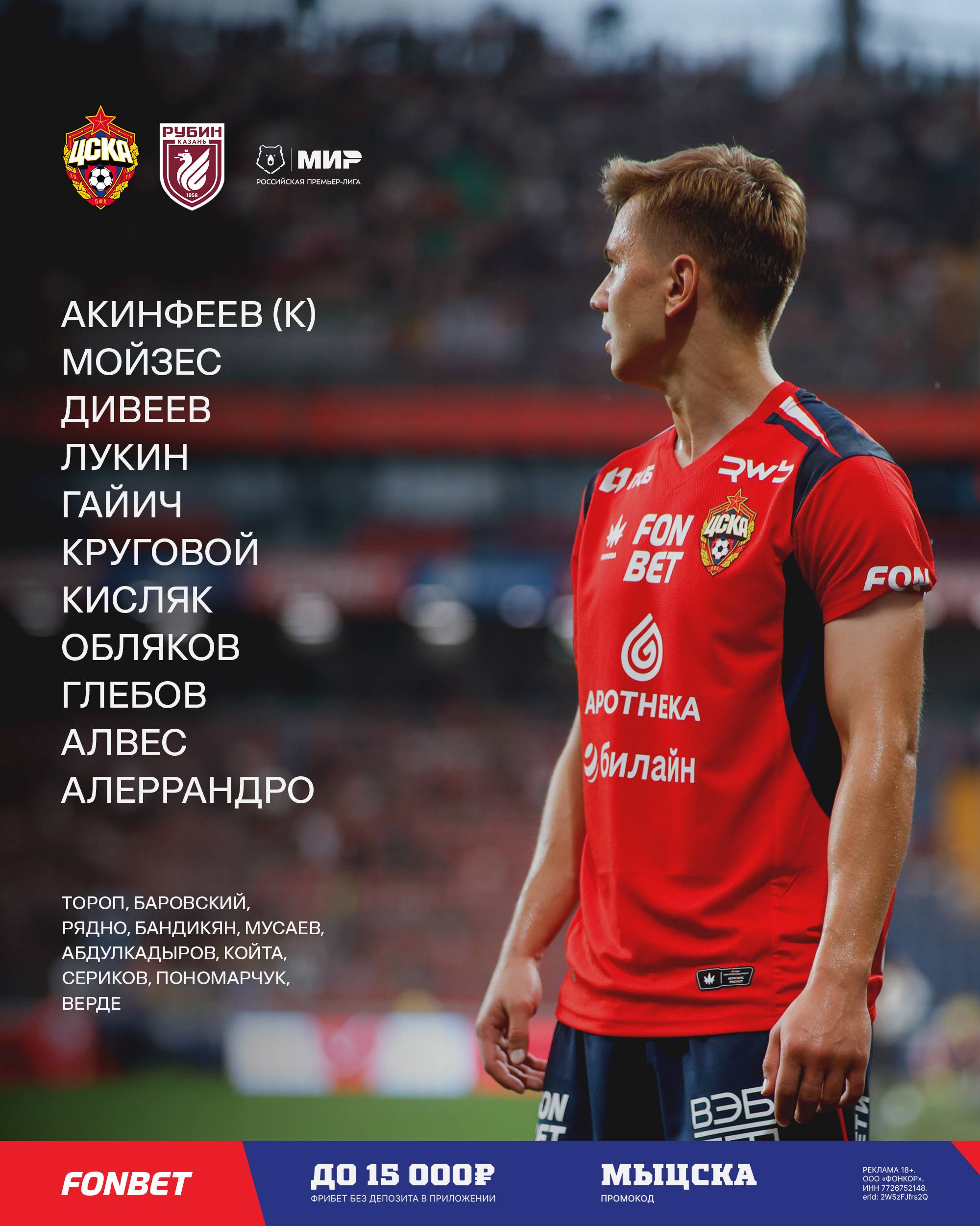 Казанский футбольный клуб «Рубин» и московский ЦСКА опубликовали составы на матч. Игра на столичной «ВЭБ Арене» начнется в 15.45.