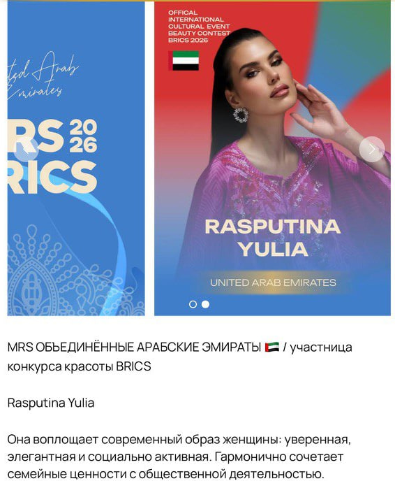 Что касается красавиц из ОАЭ, то они прилетели в Казань 28 февраля, в день, когда Эмираты невольно попали под удар военного конфликта между США, Израилем и Ираном. Примечательно, что и «мисс» и «миссис» из ОАЭ с русскими именами и фамилиями – Анастасия Семенова и Юлия Распутина.