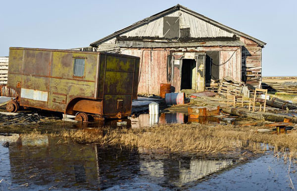Дом в тундре, в котором раньше жили геологи. После отъезда на материк они бросили свою технику на произвол судьбы. Этот металлолом экспедиторы «Зеленой Арктики» разобрали и доставили на берег моря.