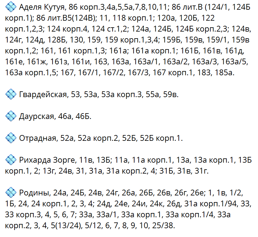 Отключение затронет следующие адреса: