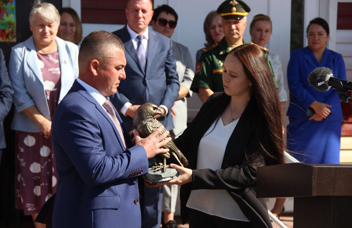 Супруга героя Наталья Соколовская передала школе семейную реликвию – фигуру сокола из бронзы.