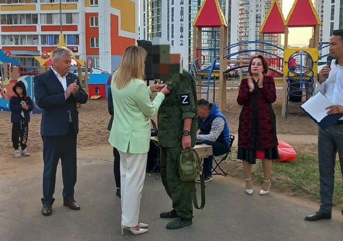 Заместитель мэра города Ирина Сагидуллина торжественно вручила памятную медаль «100 лет со дня рождения Махмута Гареева» одному из участников спецоперации, который находится в отпуске.