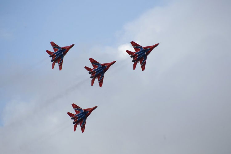 Около часа дня после небольшого затишья небо разрезал первый из четырех МиГ-29. Одиночные выступления и групповой высший пилотаж, включавший движение знаменитым ромбом и разнообразные перестроения, групповую бочку, колокол и зеркало, привели зрителей, в том числе и на остановившейся Кремлевской дамбе, в восторг. По словам специалистов, это требовало полной отдачи и от летчиков, и от самолетов. Напряжение момента передавал громоподобный гул двигателей на форсаже.