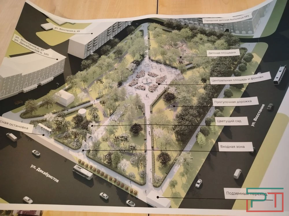На клумбах вокруг фонтана посадят розы, по периметру расставят скамейки. С улицы Декабристов будет оборудована входная зона с цветущим садом. Нижним ярусом посадят цветущие кустарники – спирею, сирень, калину, чубушник.