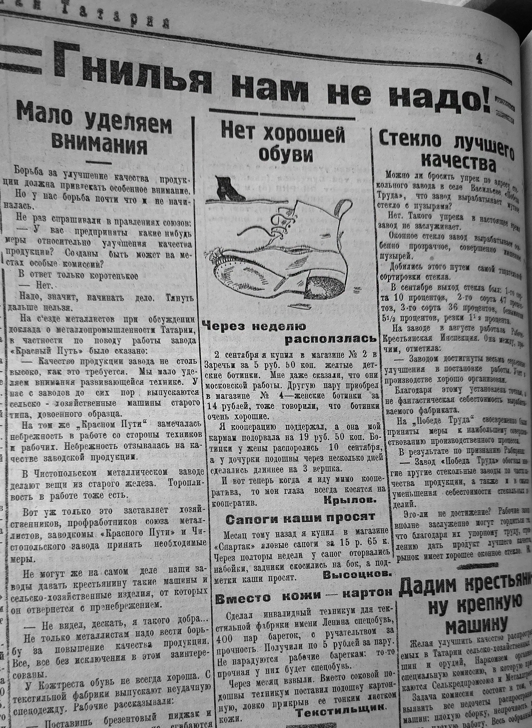 «Гнилья нам не надо!» – под таким общим заголовком в одном из октябрьских номеров опубликовано сразу несколько заметок об отвратительном качестве обуви. Один из наших казанских читателей по фамилии Крылов жалуется, что купил в одном магазине детские ботинки якобы московского производства за 5 руб. 50 коп, а в другом – ботинки для жены за за 14 рублей. Итого казанец Крылов поддержал кооперацию на 19 руб. 50 коп. В итоге у дочурки ботинки расползлись уже через несколько дней, жене новой обуви хватило на неделю.