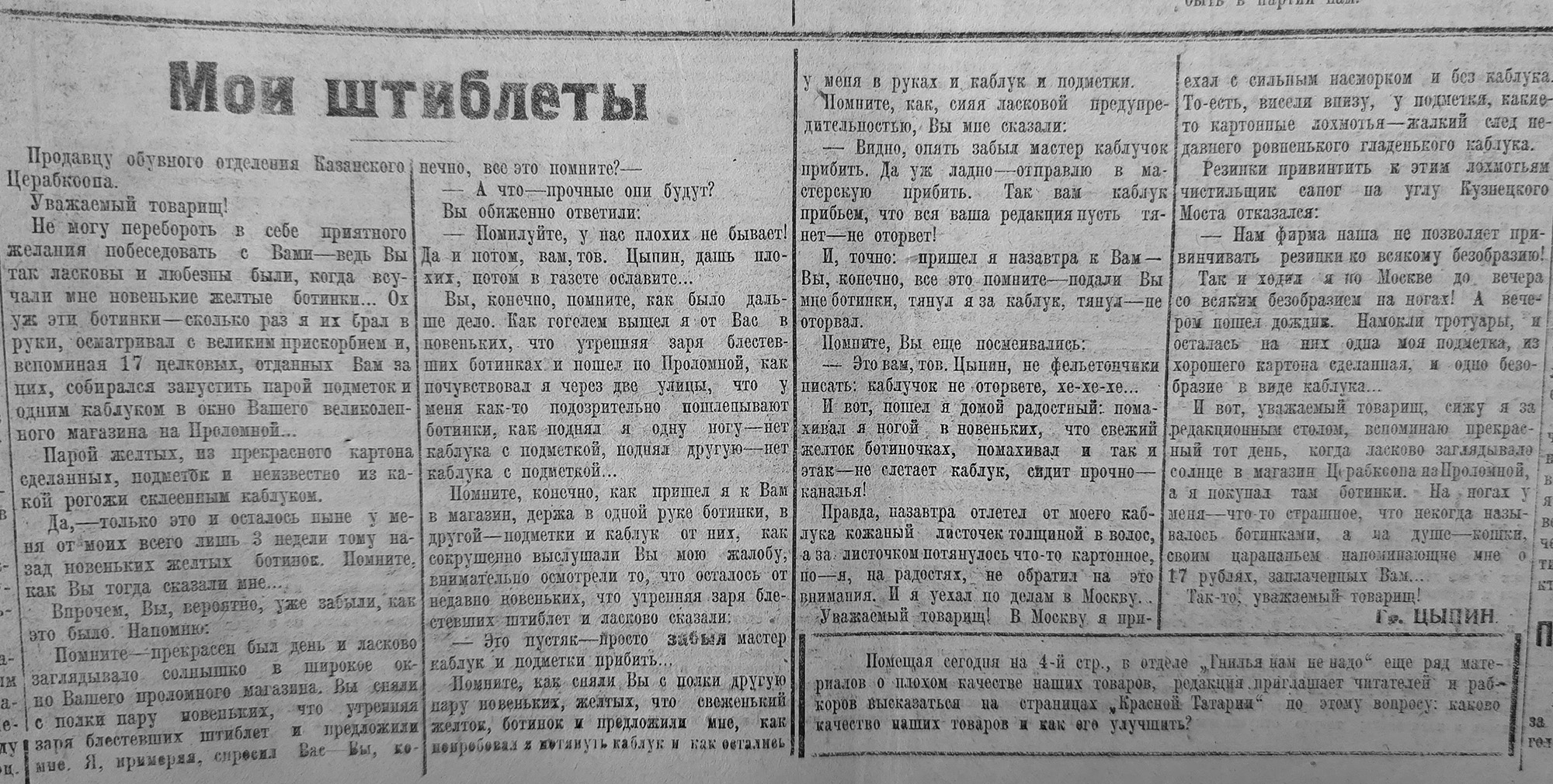 Гнилье вместо обуви приобрел и наш корреспондент Цыпин, который повествует о своих злоключениях в фельетоне «Мои штиблеты». В магазине на улице Большой Проломной (ныне Баумана) ему продали модные желтые ботинки за 17 рублей. На вопрос: «А что, прочные они будут?», продавец возмутился и заверил, что у них плохих не бывает: «Да и потом, вам, товарищ Цыпин, даешь плохих, а вы потом в газете ославите...». Торговец даже предложил покупателю даже потянуть за каблук. Цыпин потянул и каблук остался у него в руке. Продавца это ничуть не смутило, он тут же нашелся: «Видно, опять забыл мастер каблучок прибить. Отправлю в мастерскую, так вам каблук прибьем, что вся ваша редакция потянет – не оторвет!». Цыпин пришел в магазин на следующий день, потянул каблук со всей силы – не смог оторвать. Продавец опять подколол: «Это вам, товарищ Цыпин, не фельетончики писать: каблучок не оторвете». И Цыпин пошел домой довольный в новеньких желтых ботиночках. А потом поехал по делам в Москву. До столицы он добрался уже без каблука, на его месте торчали какие-то картонные лохмотья. Обувной мастер в столице наотрез отказался ему помогать и привинчивать каблук «ко всякому безобразию». Так Цыпин и ходил по Москве до вечера, а потом пошел дождь, намочил тротуары, на которых осталась подметка от желтых ботинок Цыпина, также сделанная из картона.
