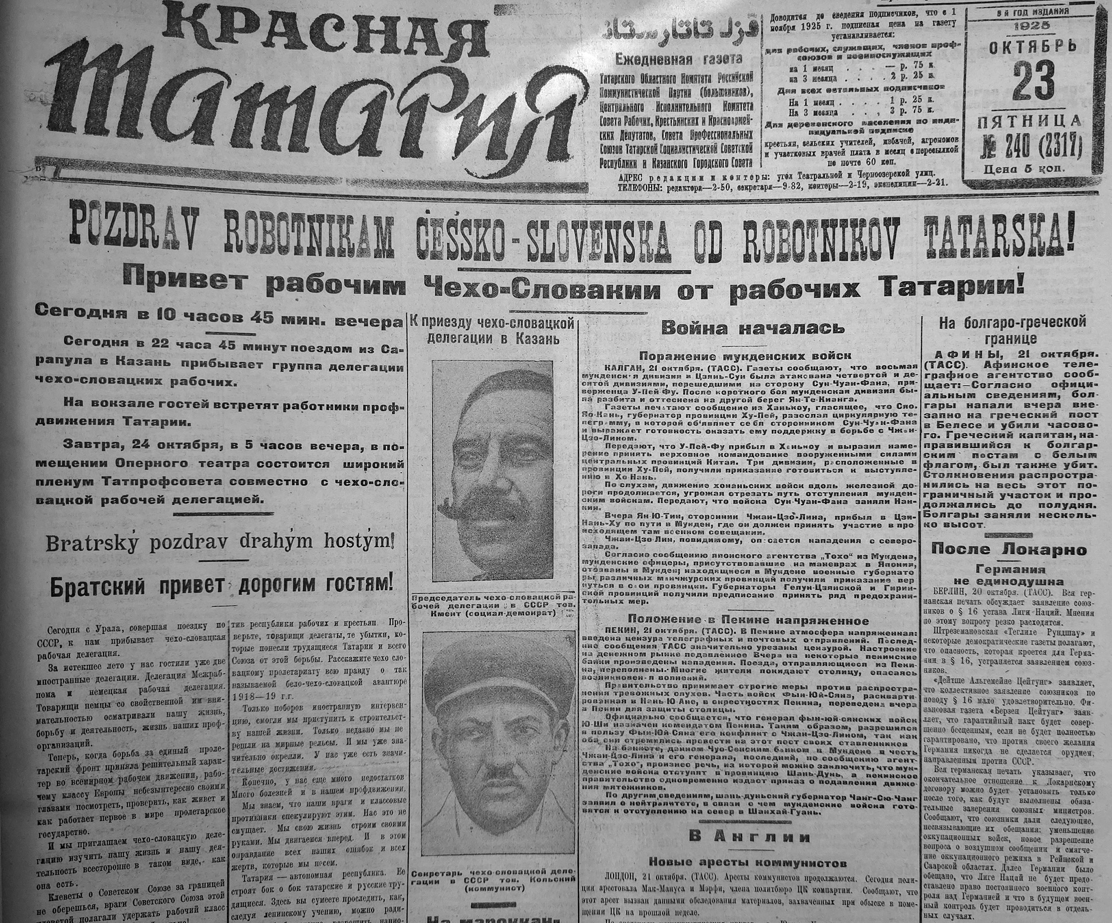 23 октября на поезде из Сарапула в Казань прибыла делегация чехословацких рабочих. «Красная Татария» вышла с заголовком на чешском языке, который в переводе на русский означал: «Привет рабочим Чехословакии от рабочих Татарии!».