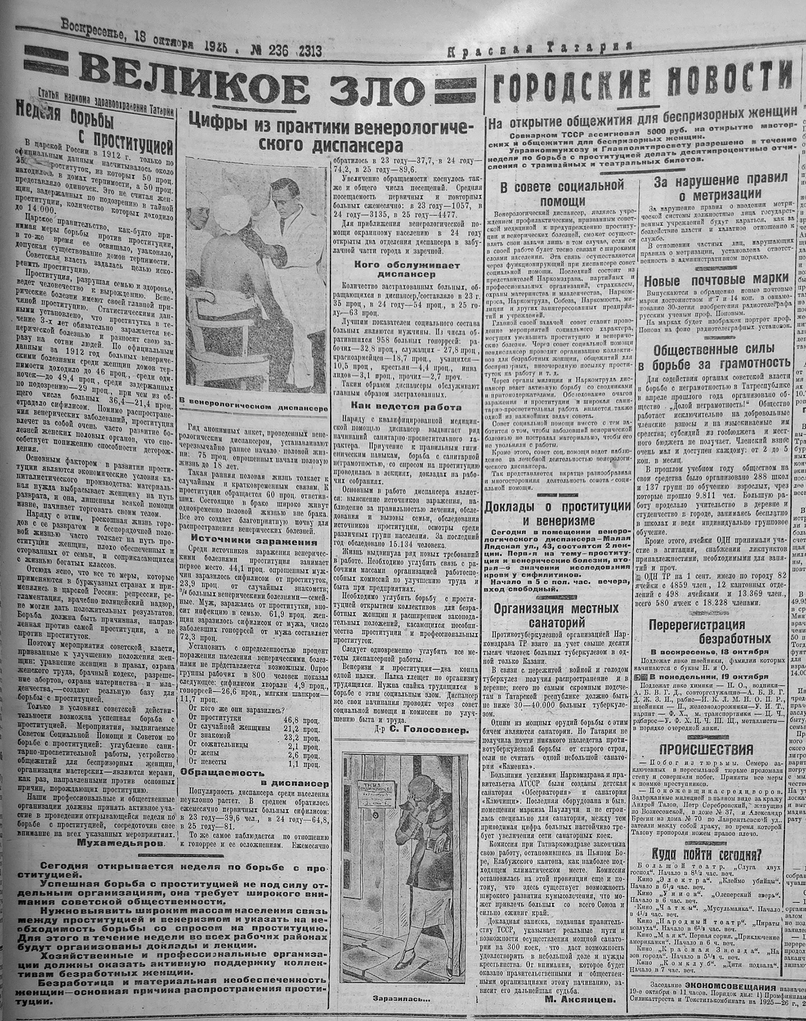 «Безработица и материальная необеспеченность женщин – основная причина распространения проституции», – заявляет «Красная Татария». А доктор Голосовкер на страницах нашей газеты предупреждает о неразрывной связи между проституцией и венерическими заболеваниями. «Венеризм и проституция – два конца одной палки. Палка хлещет по организму трудящихся. Нужна спайка трудящихся в борьбе с этим социальным злом», – резюмирует врач.
