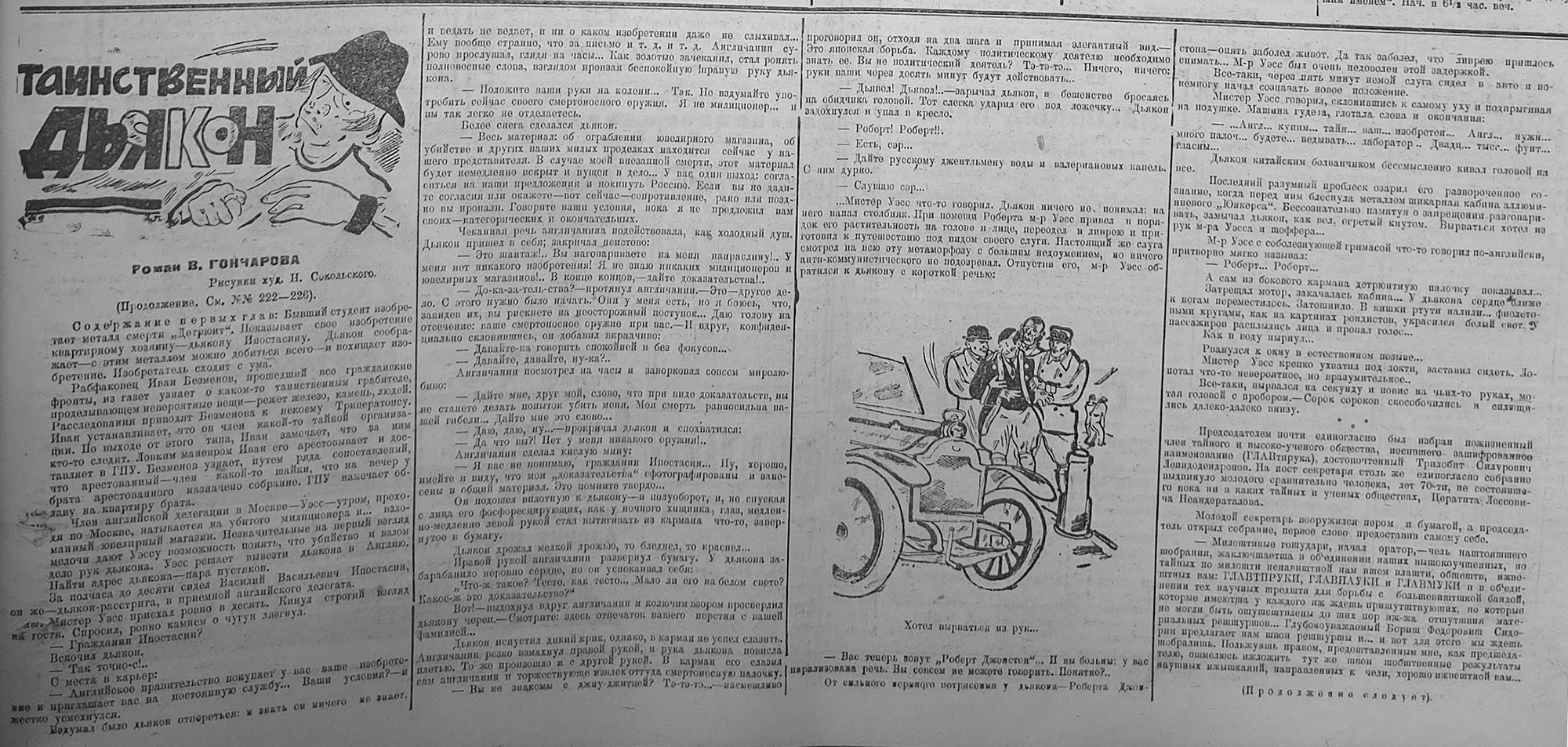 В нескольких номерах нашей газеты печатался в сокращенном варианте роман одного из пионеров советской научной фантастики Виктора Гончарова «Таинственный дьякон».