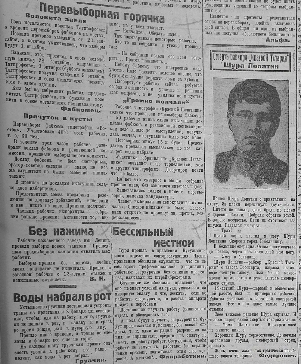 В октябре трагически погиб рабкор «Красной Татарии», комсомолец-активист 19-летний Шура Лопатин.