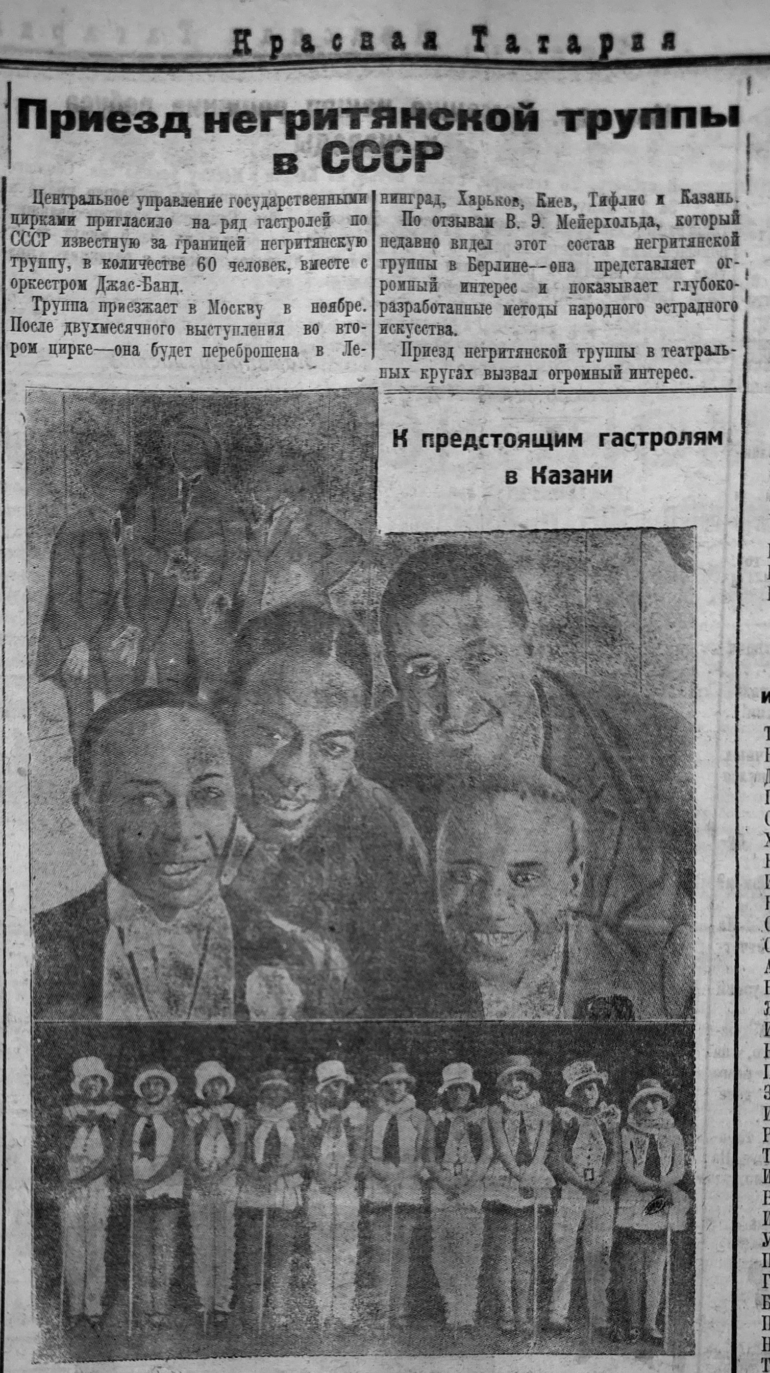 Одним из самых громких событий на культурном фронте стал ожидаемый приезд в Казань в рамках гастролей по СССР негритянской цирковой труппы в составе 60 человек с оркестром «Джас-банд». «По отзывам режиссера В. Э Мейерхольда, который недавно видел этот состав в Берлине, труппа представляет огромный интерес и показывает глубоко разработанные методы народного эстрадного искусства», – говорится в анонсе.