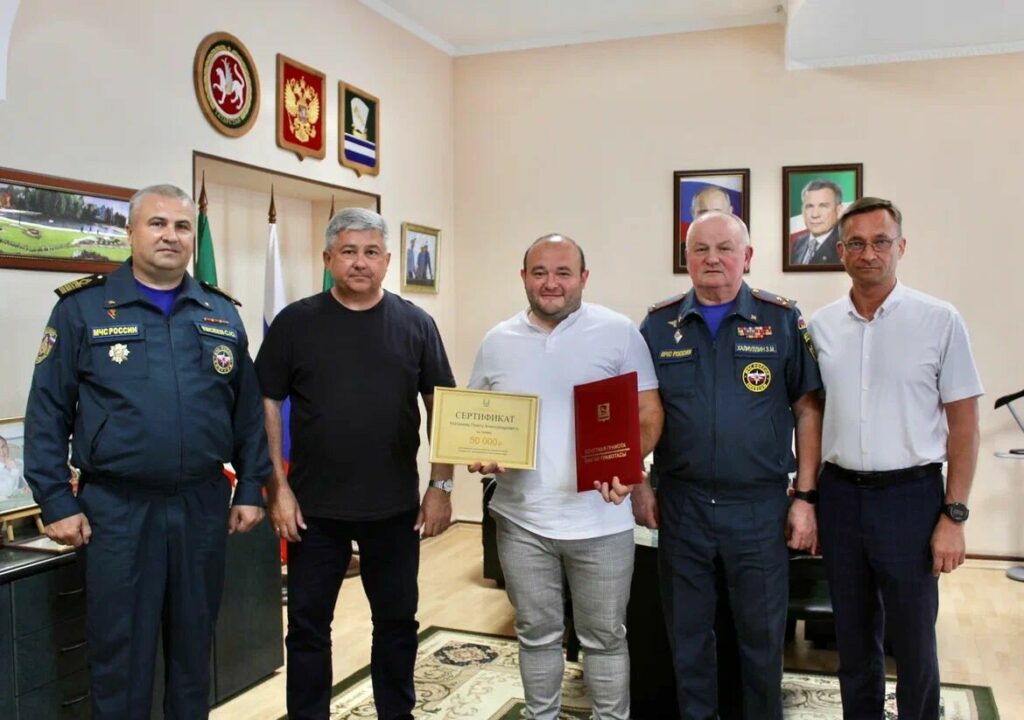 А сегодня руку мужественного добровольца-спасателя пожал глава Зеленодольского района Михаил Афанасьев. От имени всего руководства муниципалитета, от имени всех жителей Зеленодольского района он выразил слова признательности и вручил Павлу Матвееву Почетную грамоту главы Зеленодольского района, сертификат на денежную премию в размере 50 тысяч рублей и новый водонепроницаемый смартфон (который оказался очень кстати, ведь старый телефон Павла после того, как побывал в воде, стал плохо работать).