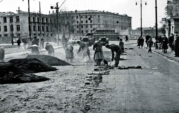 Восстановительные работы на площади Ленина в Воронеже после окончания войны.