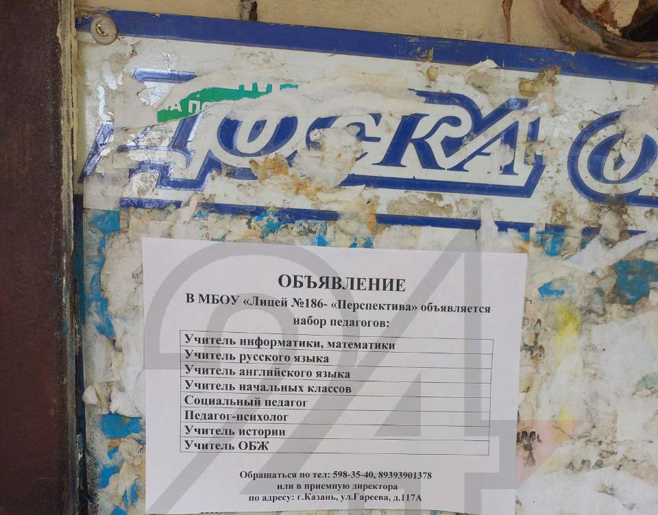 Ну и, конечно, в канун учебного года глава Минобрнауки РТ поднял больную тему нехватки учителей: школам нужны 2,3 тыс. педагогов. В самом большом дефиците учителя математики (393 вакансии), русского языка (312) и начальных классов (357). Некоторые школы, видимо, настолько отчаялись найти кадры, что стали развешивать объявления на подъездах домов. Например, по такому пути пошел казанский лицей №186. Здесь требуются учителя информатики, математики, русского и английского языков, ОБЖ, начальных классов и истории.