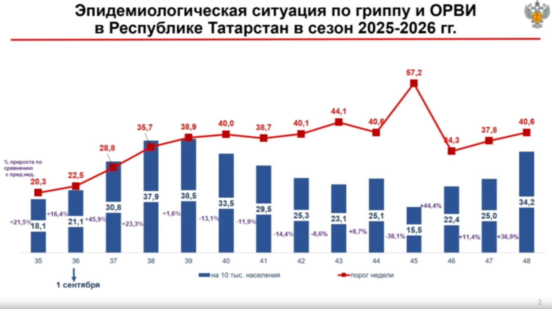 За прошлую неделю в Татарстане ОРВИ заболели 13,7 тыс. человек. Из них 363 человека подхватили грипп, а 223 – коронавирус. Прирост за неделю составил почти 37%. О готовности медучреждений республики к дальнейшему сезонному росту заболеваемости, о том, сколько коек смогут развернуть в стационарах, рассказали сегодня на брифинге в Кабмине РТ.