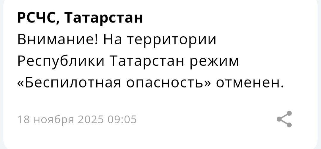 Спустя почти 10 часов в Татарстане снят режим беспилотной опасности
