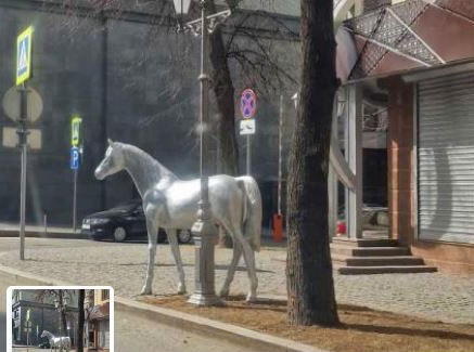 В Казани на перекрёстке улиц Малая Красная и Бассейная установлена статуя лошади в качестве рекламы магазина Vip. Прошу её демонтировать, так как конструкция не согласована с исполкомом, является рекламой магазина, установленной без разрешения властей района, может упасть и нанести травмы людям, портит облик города, продвигает зарубежные марки недружественных стран.