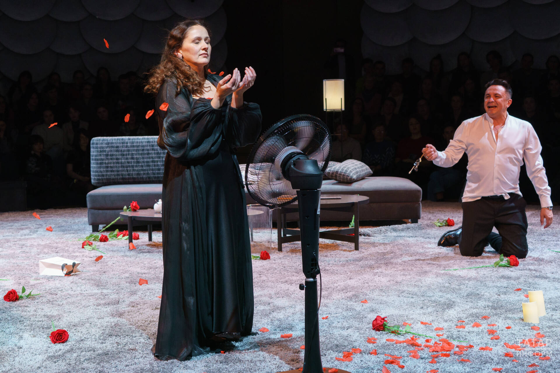 Но вернемся к «Любовнику». Спектакль идет в круглом Восточном зале, что, по мысли режиссера, должно усилить ощущение полной отрешенности героев от внешнего мира. Внутри же самого круга художником Ибрагимом Булатовым любовно создается обстановка обволакивающего комфорта. Тут и призывно разбросанные подушки, и ковер с высоким ворсом, усыпанный лепестками роз, и тому подобная пошлость. Довершает же картину сама учительница в достаточно откровенном по театральным меркам пеньюаре, который несколько комично рифмуется в том же интерьере со стопкой школьных тетрадей.