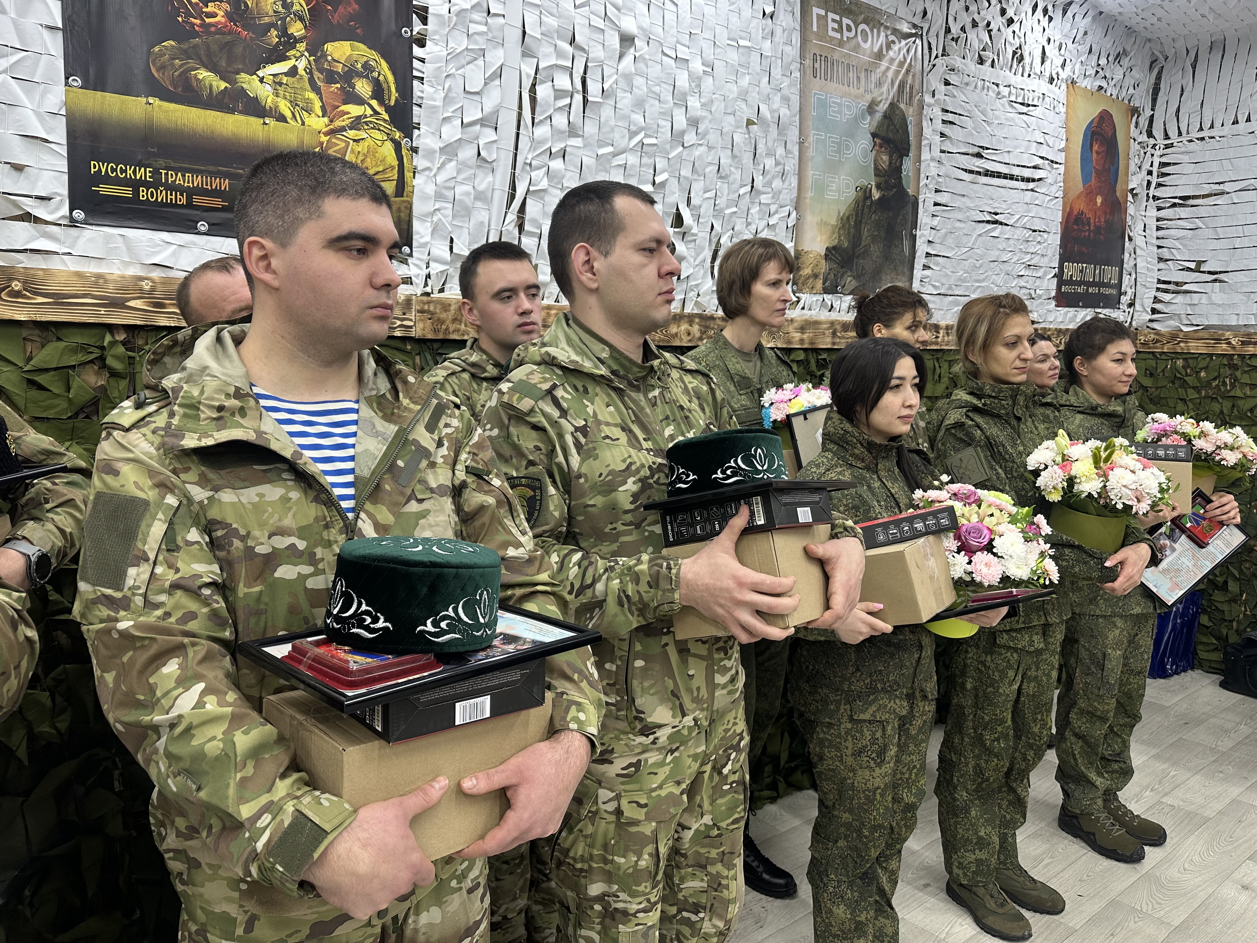 Татарстанцы по традиции на одном из опорных пунктов, куда добрались на бронеавтомобиле «Тайфун-К», встретились и пообщались с бойцами, среди которых были и женщины, работающие в качестве медперсонала. Равиль Ахметшин вручил отличившимся в службе памятную медаль «100 лет генералу армии Махмуту Гарееву» и подарки, в том числе вкусные гостиницы.