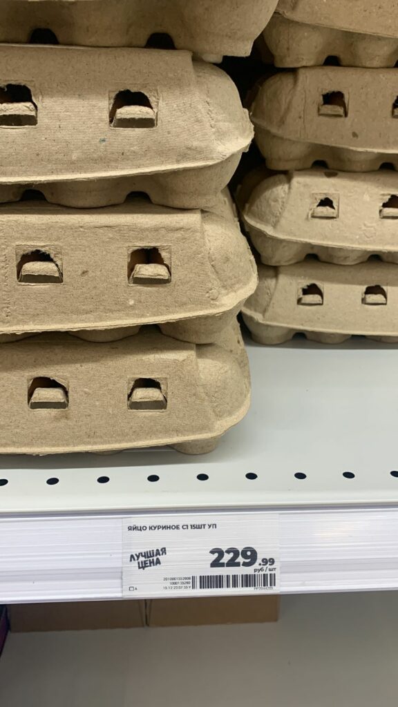 Уже при мне продавщица наклеила ценник на прилавок со свежепривезенными яйцами местной марки Yaratelle - 94 руб. 99 коп. за десяток первой категории. Соответственно эти яйца оказались самыми дешевыми на момент моего визита в магазин.