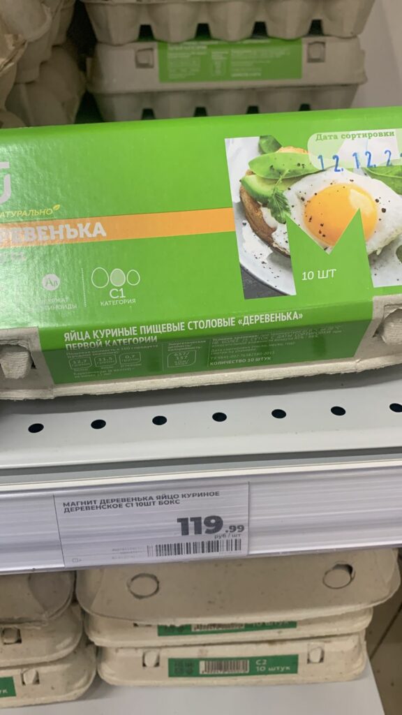 Заглянув сегодня в соседний «Магнит», корреспондент «РТ» обнаружила там яйца по следующим ценам. Десяток 1-й категории марки «Деревенька» – 119 руб. 99 коп., «Деревенские» такой же категории – уже 134 руб. 89 коп.