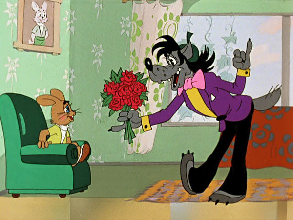 – Особенно хорошо получился Волк – он такой живой, обаятельный, узнаваемый. Но почему он узнаваем? Явно же не по фильмам о природе – с настоящим волком он не имеет ничего общего! Мы узнаём в нём сорокалетнего холостяка-неудачника – прокуренного, любящего выпить, сохранившего чувство юмора, заброшенного, порядком озабоченного. Вот зачем он гонится за несчастным зайцем! Мультяшное пространство – это просто поле для его отношений с юной девушкой! Она, видимо, связана с ним по работе – деваться некуда. А ему лишь бы затащить её в постель – то полутёмная подсобка, то корпоративчик, то парк культуры и отдыха... Ей всегда приходится быть настороже. Но она относится к этому с юмором, возможно, ей даже льстит его внимание – ведь он такой обаятельный…