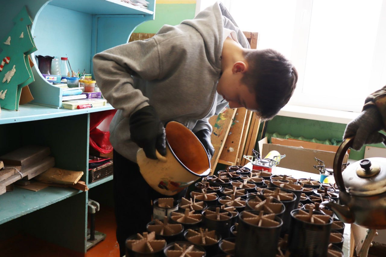 «Парафин нарезаем небольшими кусочками, затем плавим его в чайнике или кастрюле. На это обычно уходит около 10-15 минут, потом уже разливаем по банкам, одного чайника обычно хватает на 6-7 свечей. Но на этом дело не заканчивается: когда парафин застынет, нужно еще доливать его», — рассказал один из учеников, Егор Егорчатов. Он подчеркнул, что в этой работе необходимо соблюдать правила техники безопасности.