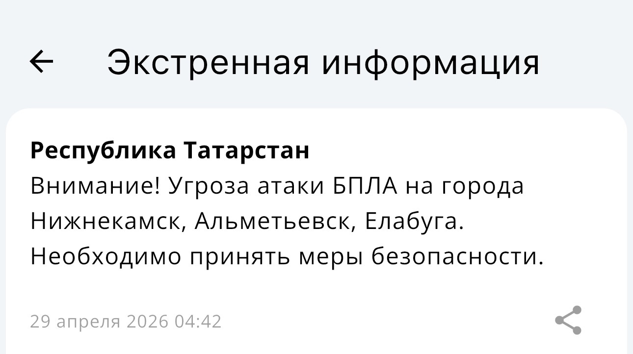 На три города Татарстана – Нижнекамск, Альметьевск и Елабугу объявлена угроза атаки беспилотников. Об этом жителей предупреждает МЧС.