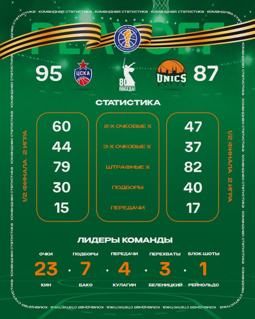 При этом в первой половине матча казанцы вели — 28:20 и 45:41 в двух десятиминутках. Однако затем инициатива перешла к ЦСКА — 69:67 и 95:87 в финальной.