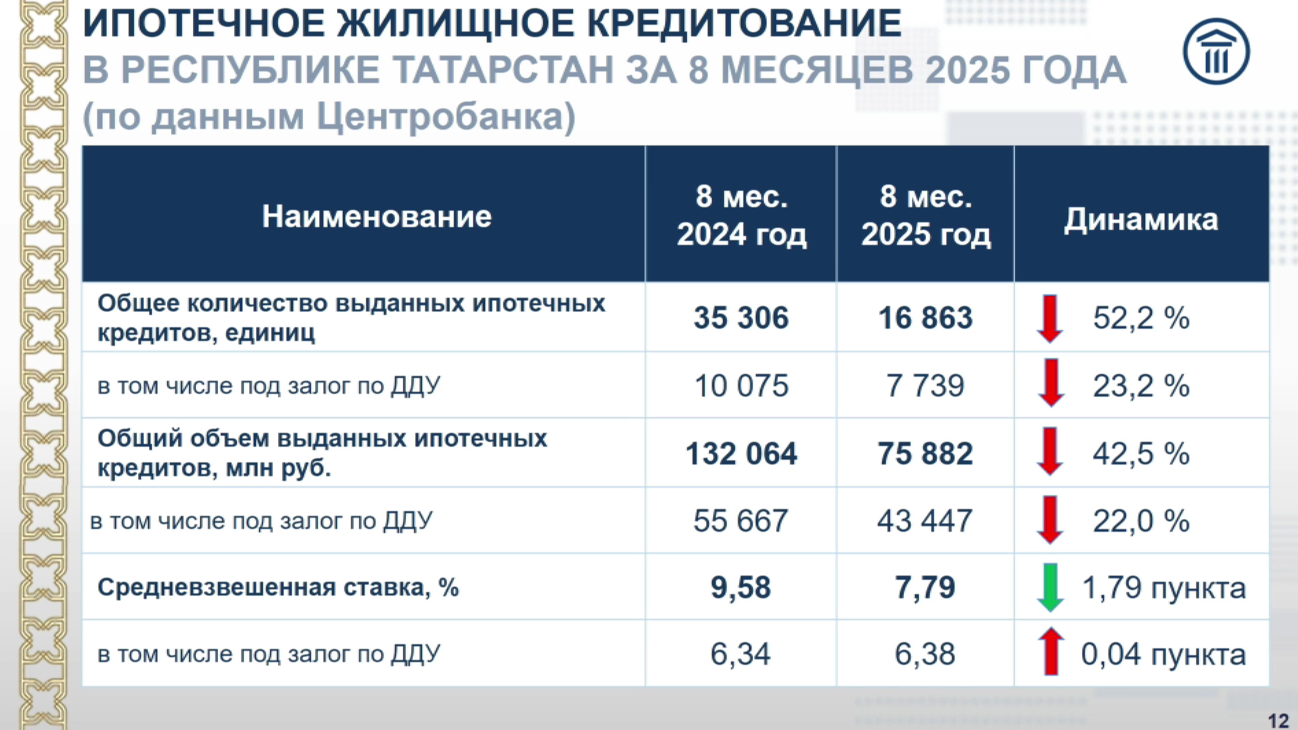 За восемь месяцев 2025 года в Татарстане количество выданных ипотек снизилось наполовину – на 52,2%. Об этом на брифинге в Кабмине рассказал министр строительства архитектуры и ЖКХ республики Марат Айзатуллин.