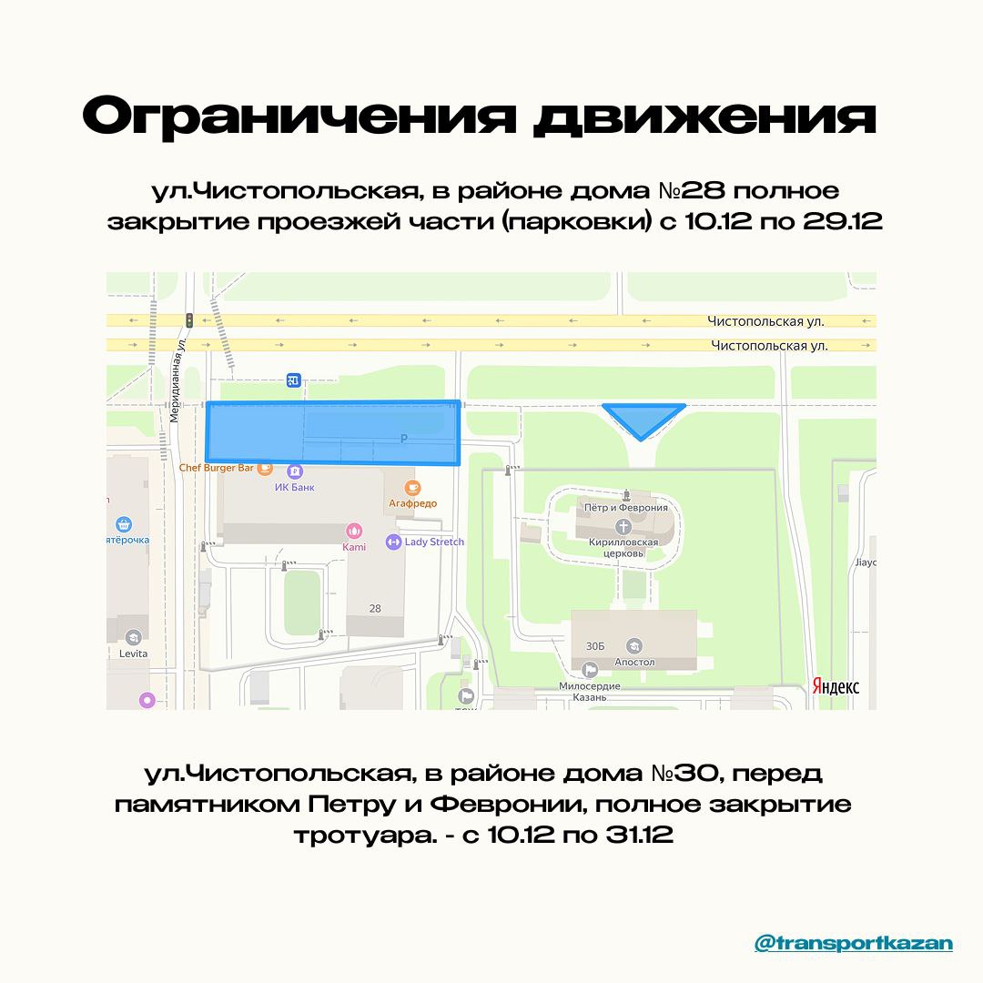 Так, по 29 декабря для автомобилистов будет недоступна парковка по улице Чистопольской, 28, до 31 декабря возле дома №30 полностью закроют тротуара.