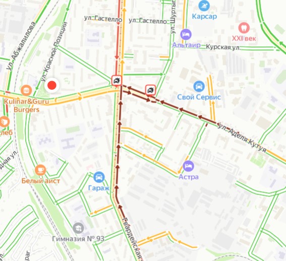 Как видно на "Яндекс.карте" автомобильное движение на перекрестке двух улиц почти замерло. Пользователи пишут, что Аделя Кутуя почти полностью перекрыта в одну сторону из-за аварии. Да и на Гвардейской - дела не лучше, водители советуют выбирать другой маршрут.