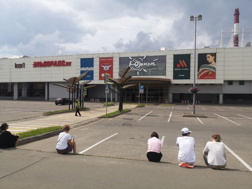 Когда корреспондент "РТ" прибыл на место событий, он услышал, как сотрудник охраны с мегафоном призывал любопытствующих зевак отойти от торгового комплекса на безопасное расстояние.