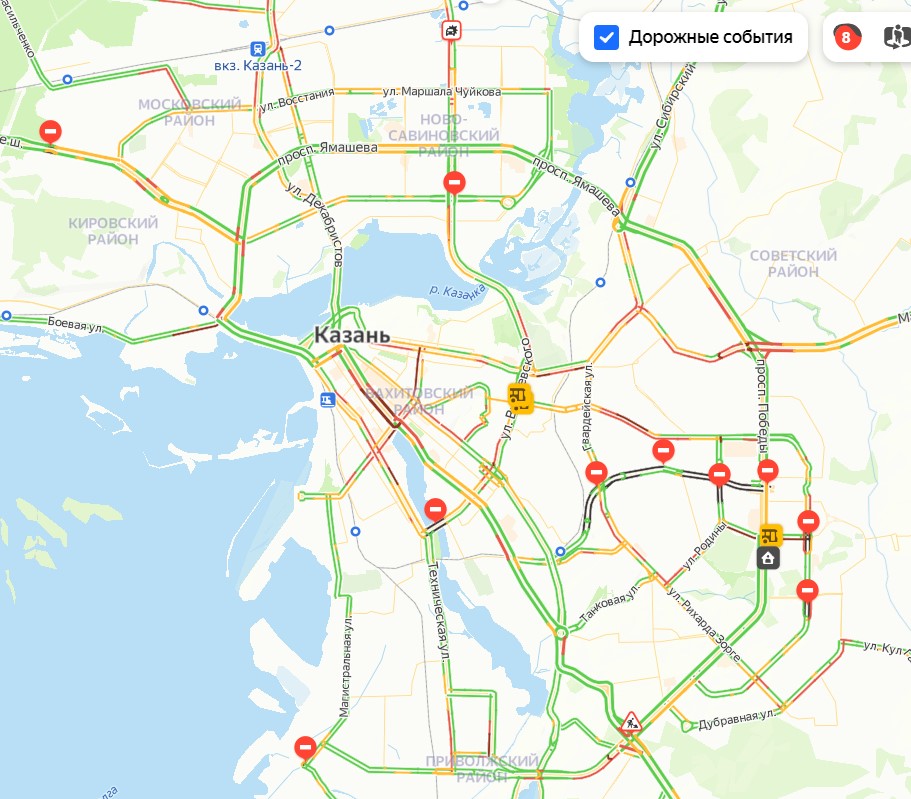 Сегодня вечером в Казани образовались пробки в 8 баллов.