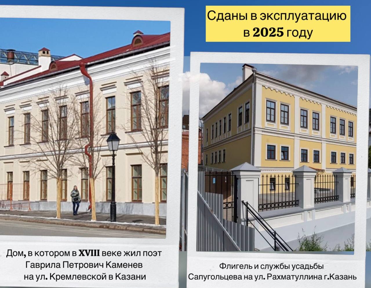 В этом году в Казани ввели в эксплуатацию три значимых объекта культурного наследия — это флигель и службы усадьбы Сапугольцева на ул. Рахматуллина и дом, в котором в XVIII веке жил поэт Гаврила Каменев на Кремлевской. Об этом сообщает пресс-служба Комитета РТ по охране объектов культурного наследия.