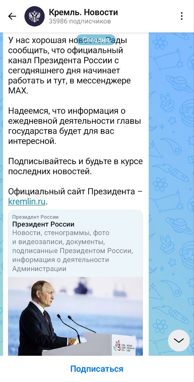 «Подписаться на канал можно здесь – max.ru/news_kremlin», – сказано в сообщении.