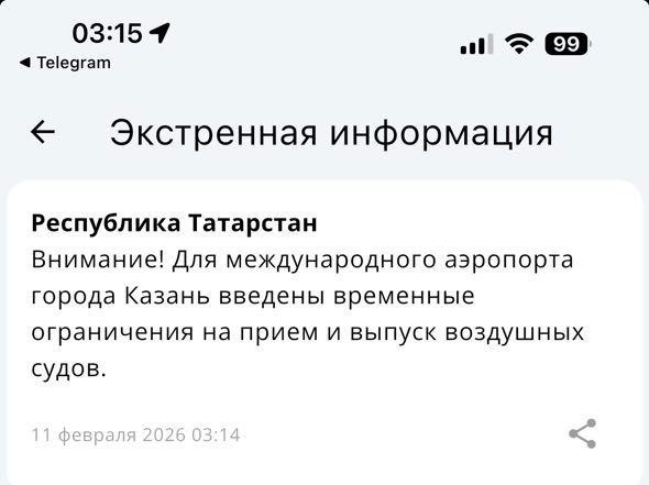 Далее последовало сообщение ведомства о закрытии аэропорта Казани на прием и выпуск воздушных судов. Аналогичную информацию в своем телеграм-канале продублировала Росавиация.