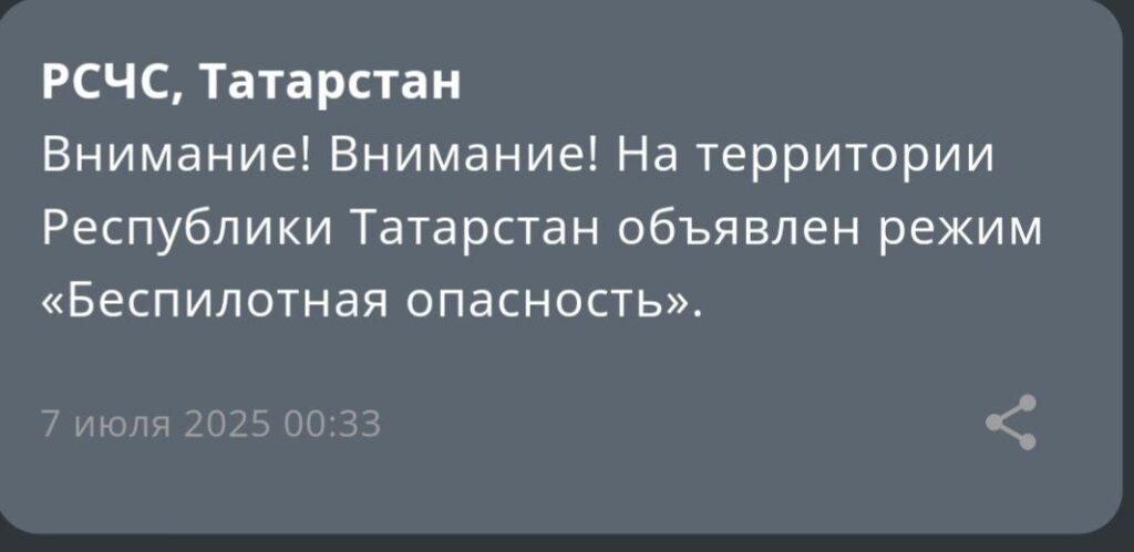 В Татарстане вновь объявлен режим беспилотной опасности. Соответствующее оповещение в своем приложении направило МЧС России.