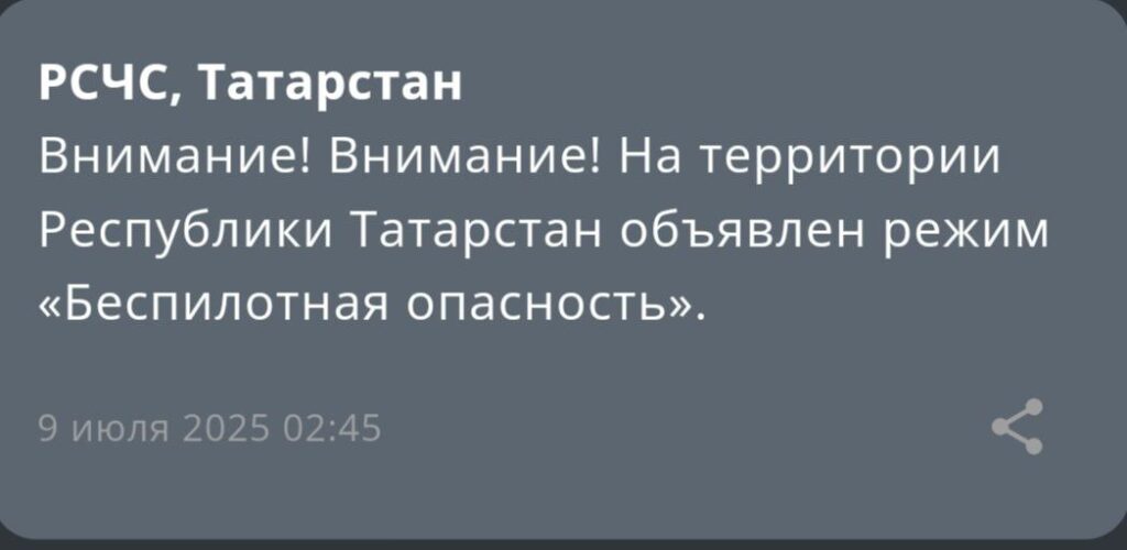 С 2.45 в Татарстане введен в действие режим беспилотной опасности. Такое предупреждение выпустило МЧС России.