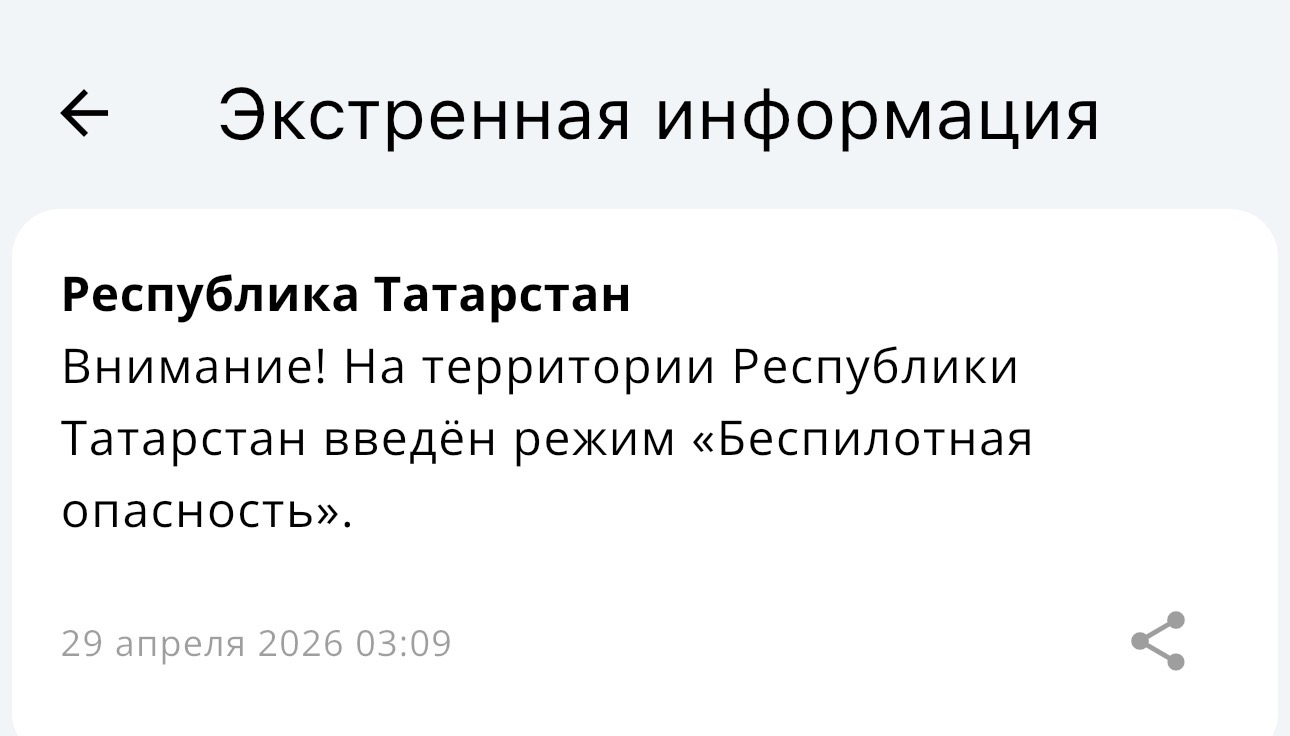 В Татарстане в 3.09 утра объявлена беспилотная опасность, аэропорты закрыты. Жителей предупредило МЧС России.
