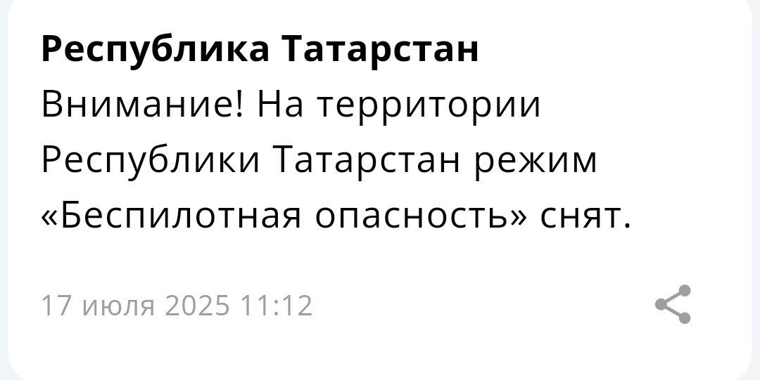 В Татарстане сняли режим «Беспилотная опасность», объявленный в пять часов утра. Оповещение пришло в приложении МЧС России.