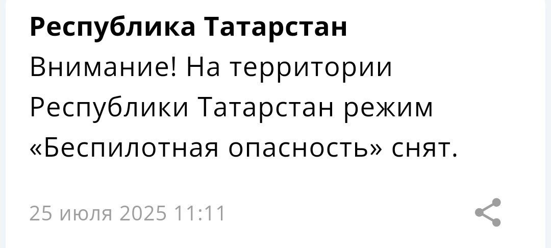 В Татарстане отменили режим беспилотной опасности, введенный ранним утром. Оповещение пришло в приложении МЧС России.