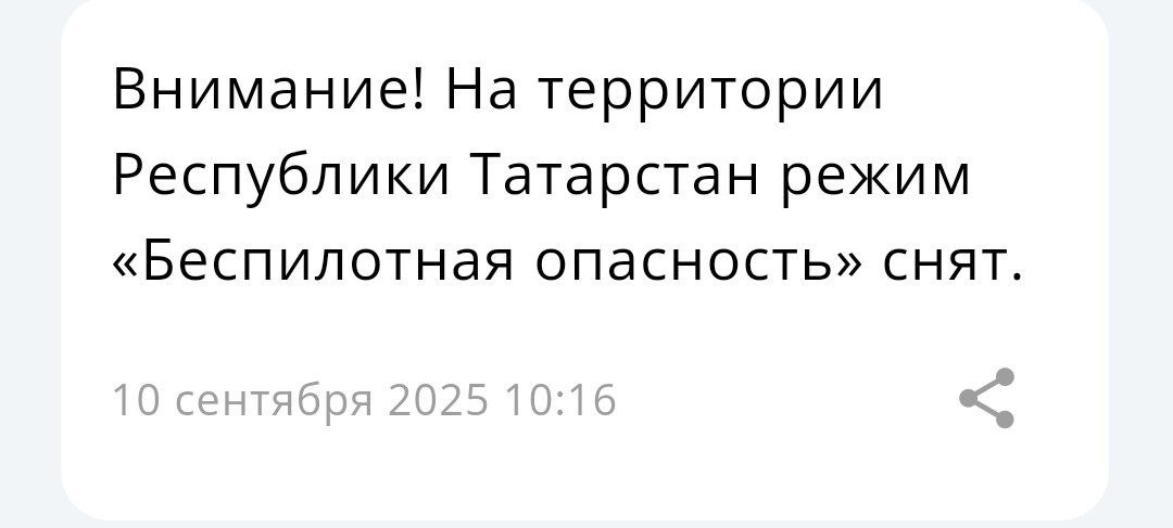 В Татарстане спустя пять часов сняли режим беспилотной опасности. Оповещение пришло в приложении МЧС России.