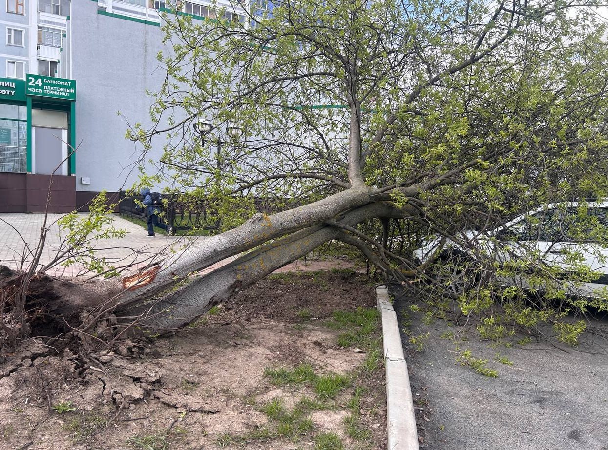 В Альметьевске штормовой ветер повалил деревья, повредил автомобили, два микрорайона города остались без электричества.