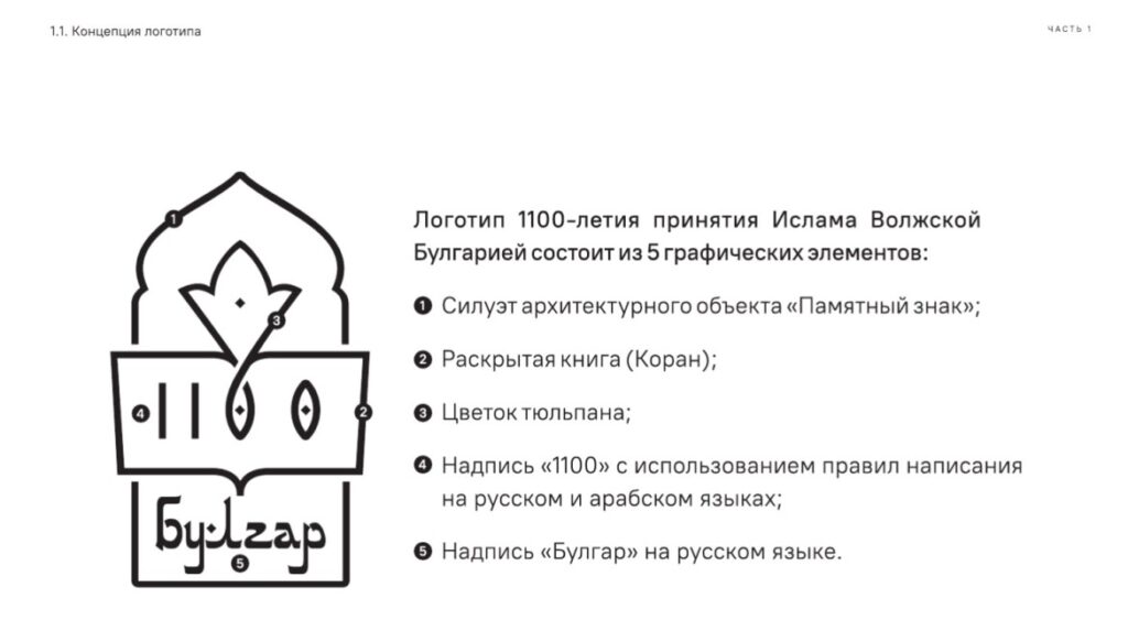 Вице-премьер РФ Марат Хуснуллин утвердил логотип и брендбук мероприятий, посвященных 1100-летию принятия ислама Волжской Булгарией. Документ содержит параметры логотипа и его описание.