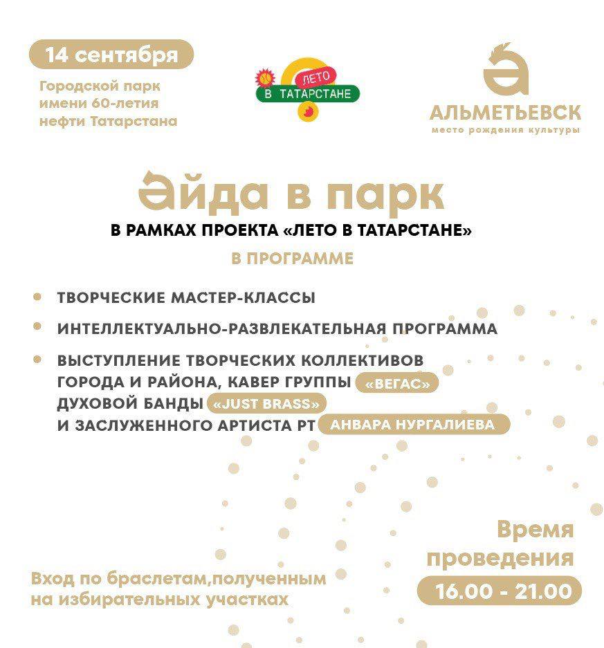 В парке имени 60-летия нефти Татарстана в Альметьевске 14 сентября состоится праздник «Айда в парк». Горожан порадуют увлекательные творческие мастер-классы и интерактивные зоны, а также выступления городских и районных коллективов. Настроение праздника поддержат зажигательные каверы от группы «Вегас» и драйвовые мелодии духовой банды «JUST BRASS». Особым гостем вечера станет заслуженный артист РТ Анвар Нургалиев.