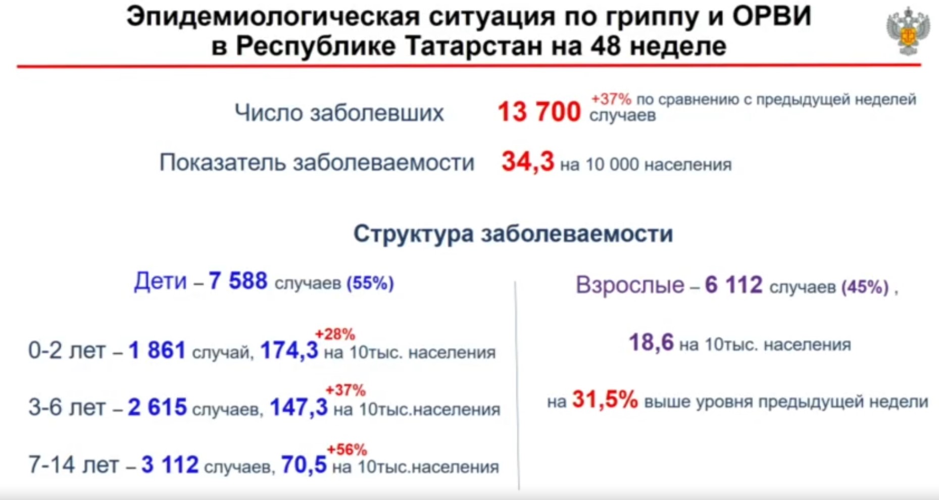 Заболеваемость гриппом и ОРВИ в Татарстане выросла на 37% за неделю с 24 по 30 ноября. В республике было зарегистрировано 13,7 тыс. случаев ОРВИ и гриппа, из которых 363 случая гриппа. Показатель заболеваемости составил 34,3 на 10 тысяч населения. Об этом заявила руководитель Управления Роспотребнадзора по РТ Марина Патяшина на брифинге в Кабинете Министров РТ.