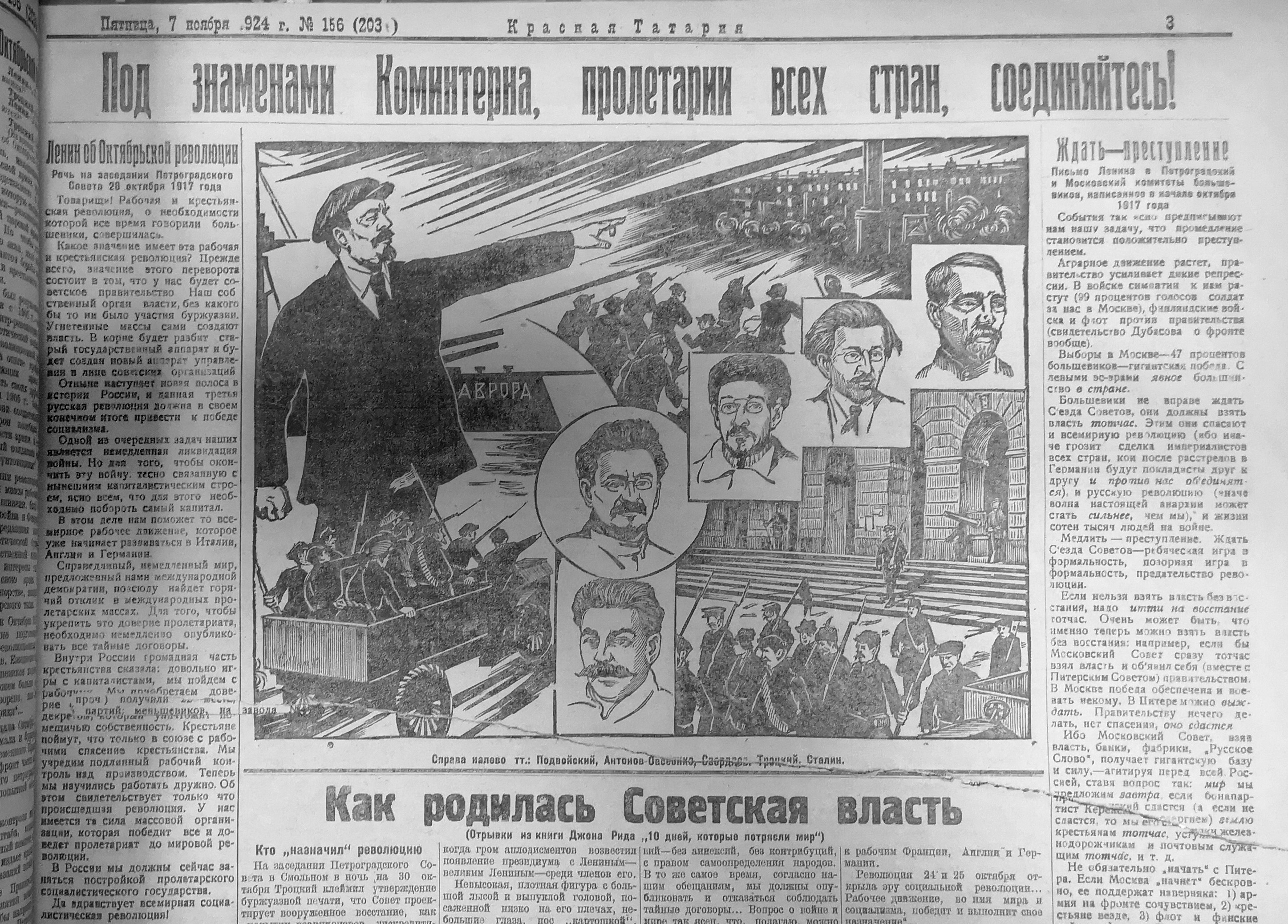 7 ноября в газете вспоминают Октябрьскую революцию 1917 года и первые семь лет советской власти. Главный демиург, конечно, Ленин. Однако семи лет советской власти не хватило, чтобы избавиться от некоторых родимых пятен прошлого. Например, рабочие завода имени Вахитова сообщили в нашу газету, что царский двуглавый орёл и штамп «Бр. Крестовниковых» и поныне можно увидеть на мыле, выпускаемом предприятием. Рабочие просят избавить их от ненавистного царского орла и памяти об эксплуататорах Крестовниковых.